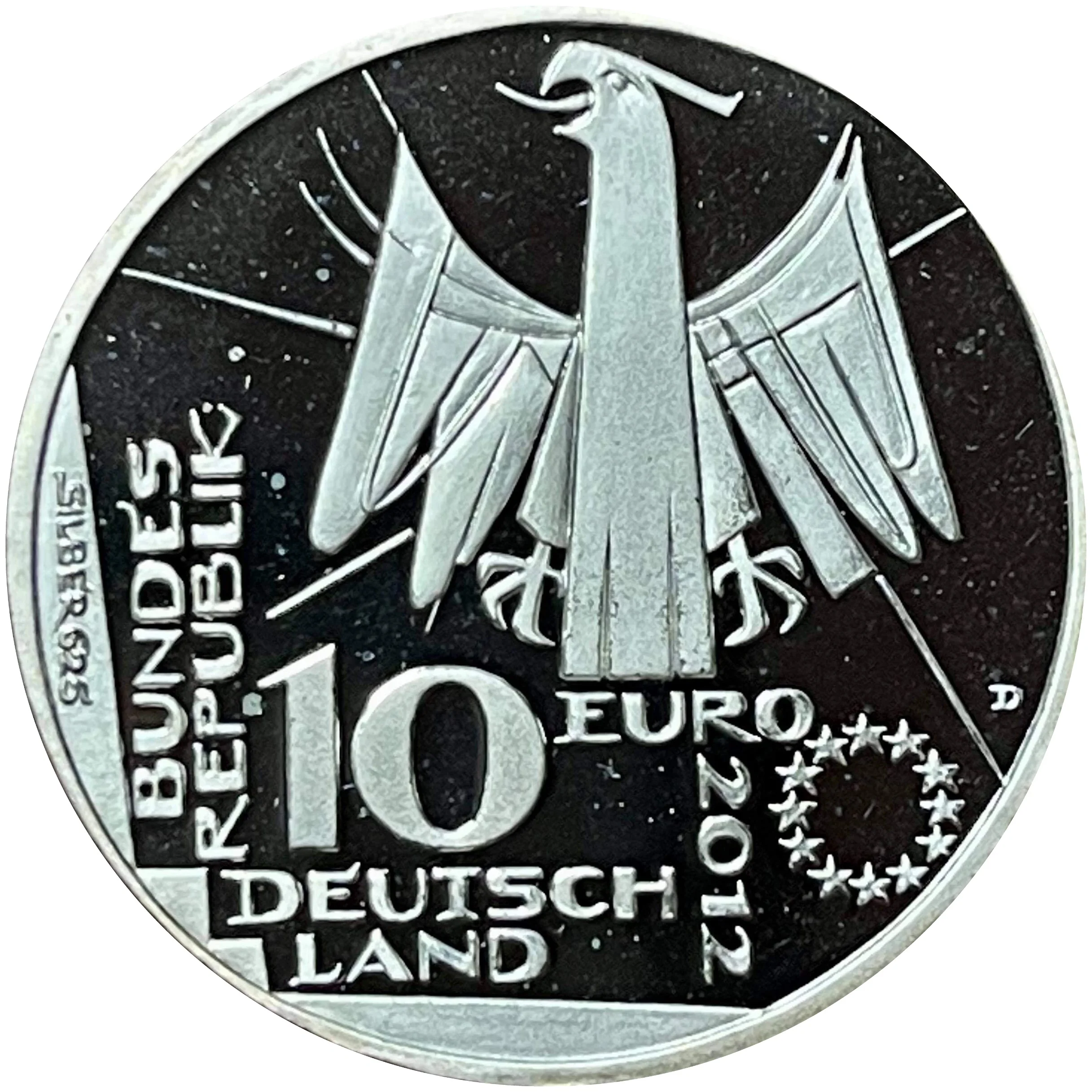The stylized federal eagle with twelve EU stars, "Silber 625", the state name "BUNDESREPUBLIK DEUTSCHLAND", and below, the year "2012", face value "10 EURO", and the Munich mint mark "D".