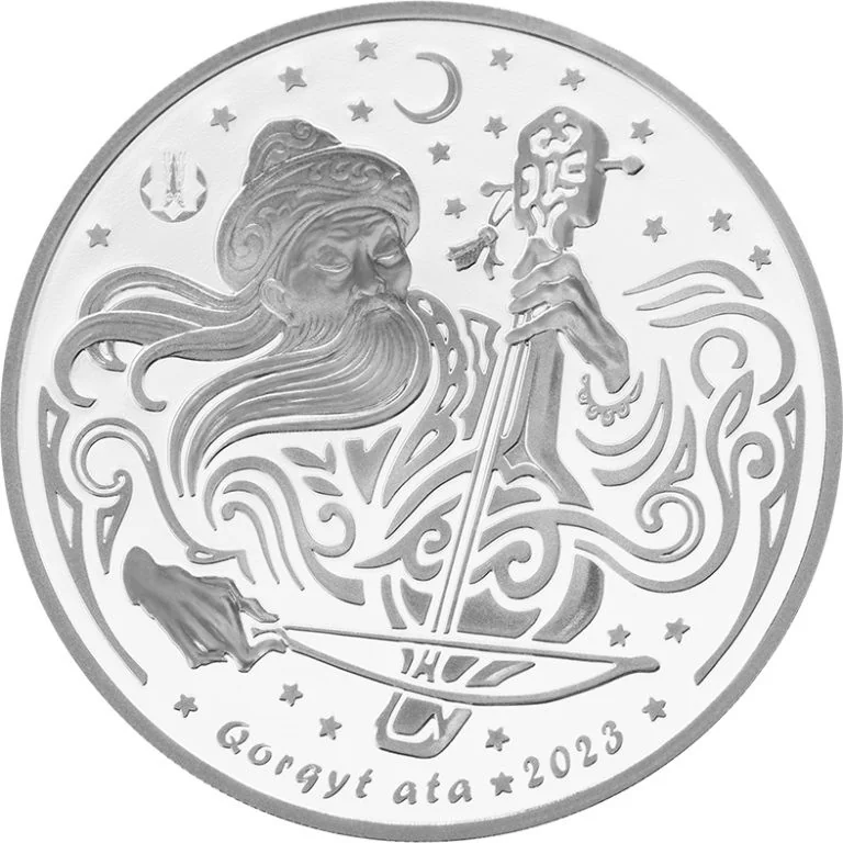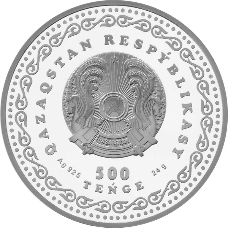 Description: The coin's circumference features national ornaments. The center displays the State Emblem of Kazakhstan, encircled by "QAZAQSTAN RESPÝBLIKASY." Below the emblem is the denomination, with the metal and fineness on the left and the weight on the right.