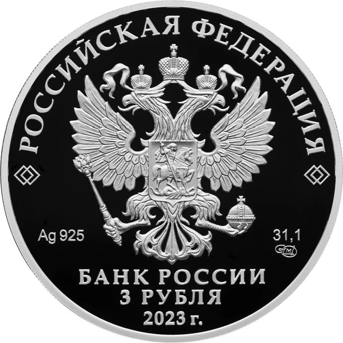 The obverse features the Russian coat of arms, inscriptions for "Russian Federation" and "Bank of Russia," the denomination "3 Roubles," the issue year "2023," the metal's chemical symbol, fineness, mint mark, and fine metal content.