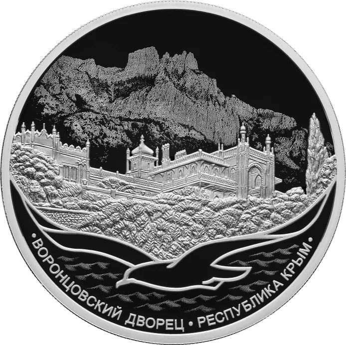 The reverse depicts the Vorontsov Palace and park with Ai-Petri Mountain in the background (matte laser treatment), a relief seagull over waves below, and the inscriptions "ВОРОНЦОВСКИЙ ДВОРЕЦ" and "РЕСПУБЛИКА КРЫМ" along the lower edge.