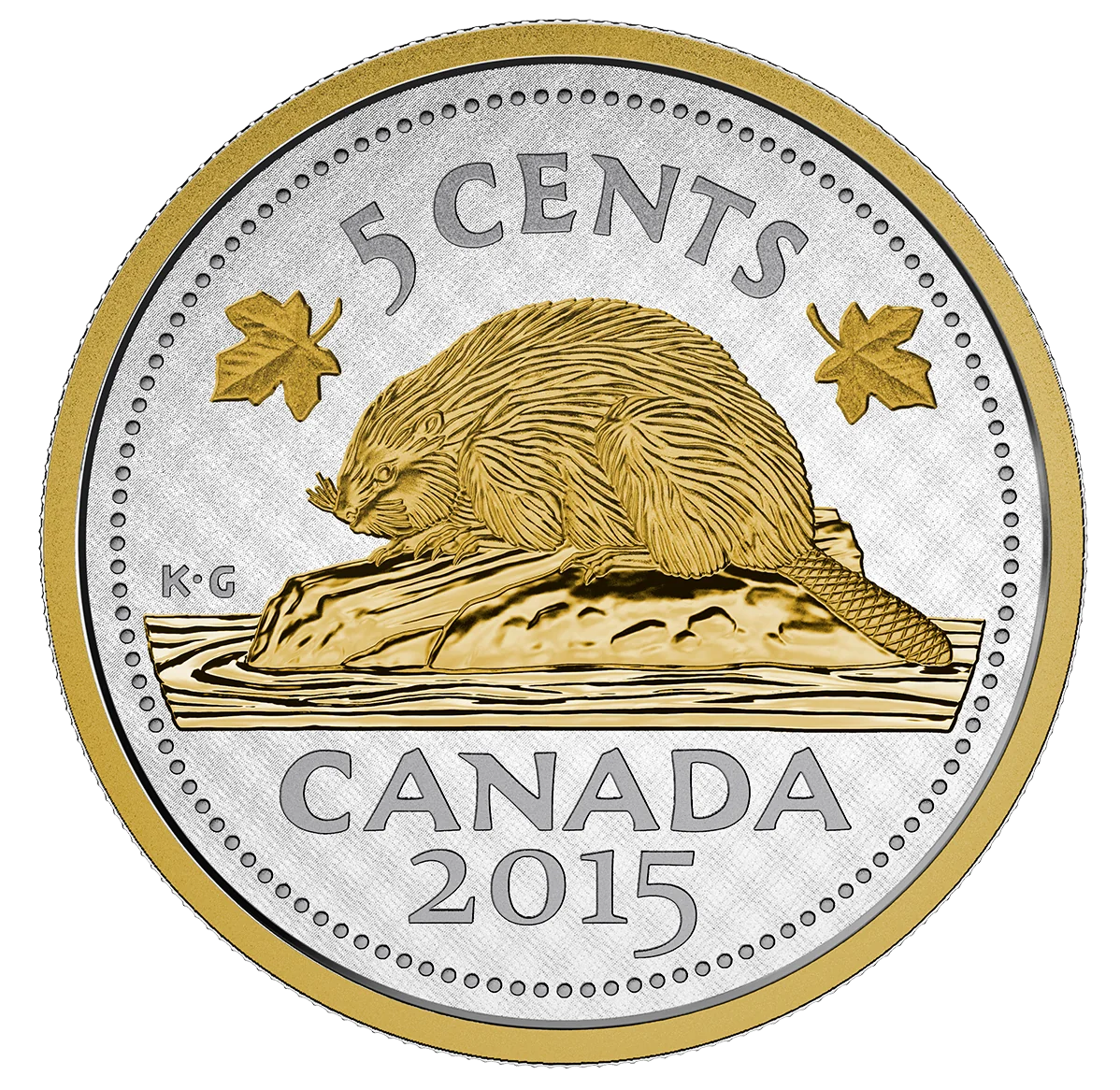The modern five-cent piece design, gold-plated beaver (1937–present).
