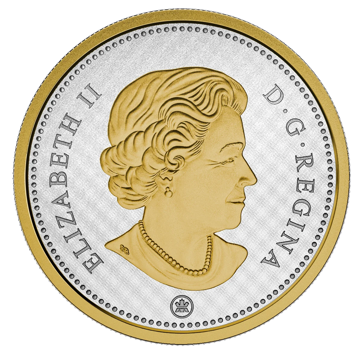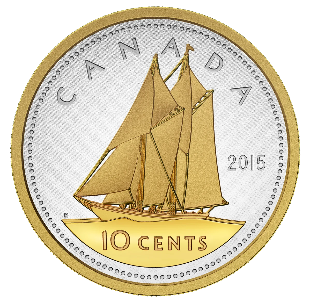 Designed by Emanuel Hahn, the gold-plated reverse features a stylized schooner under full sail on calm waters, along with "CANADA," "10 CENTS," and "2015."