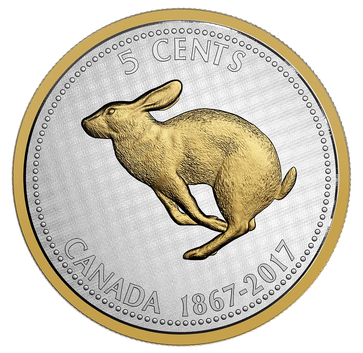 The reverse recreates Alex Colville's iconic 1967 rabbit design, captured mid-pounce with precise detail. The rabbit and beaded border are selectively gold-plated. It is inscribed with "5 CENTS", "CANADA", and the commemorative dates "1867-2017".