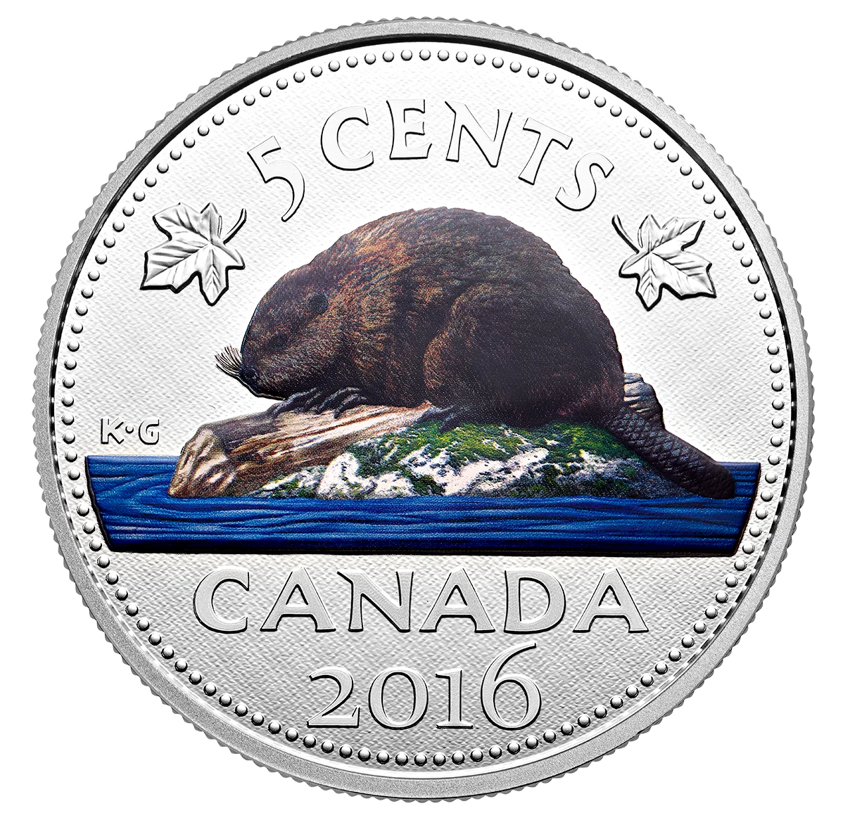 The reverse, designed by G. E. Kruger-Gray, features a left-facing beaver on a rock in water, rendered in natural brown and blue. It includes the year "2016", "CANADA", and the face value "5 CENTS".