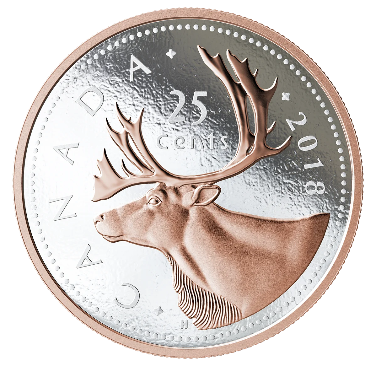 The reverse features Emanuel Hahn's rose gold-plated profile of a majestic caribou.