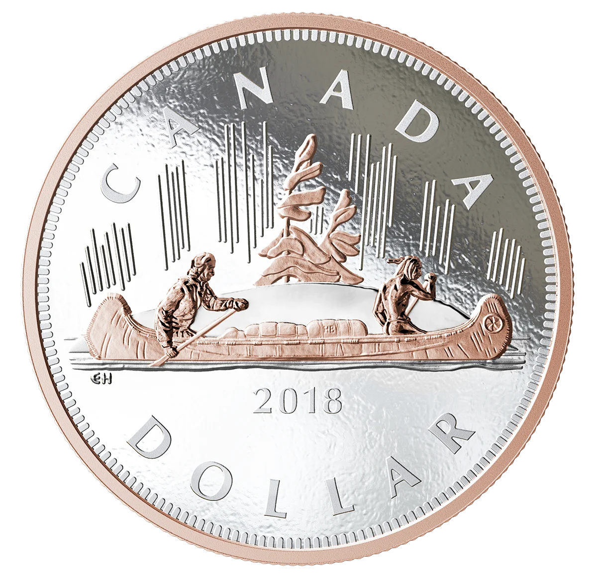 The reverse features Emanuel Hahn's Voyageur design, rose-gold plated, showing a European and Aboriginal man paddling a canoe with HB-marked furs. Behind them are windswept pines on an island and stylized aurora borealis. "CANADA," "DOLLAR," and "2018" are engraved.