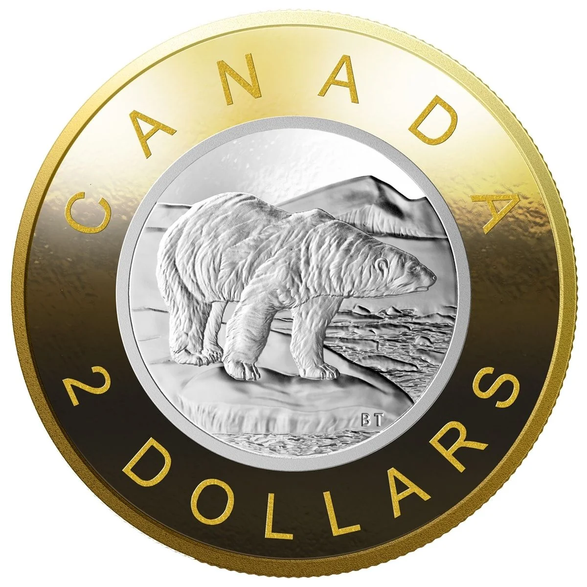 The reverse, by Brent Townsend, shows a polar bear on an ice floe surveying the Arctic summer landscape, with "CANADA" and "2 DOLLARS".