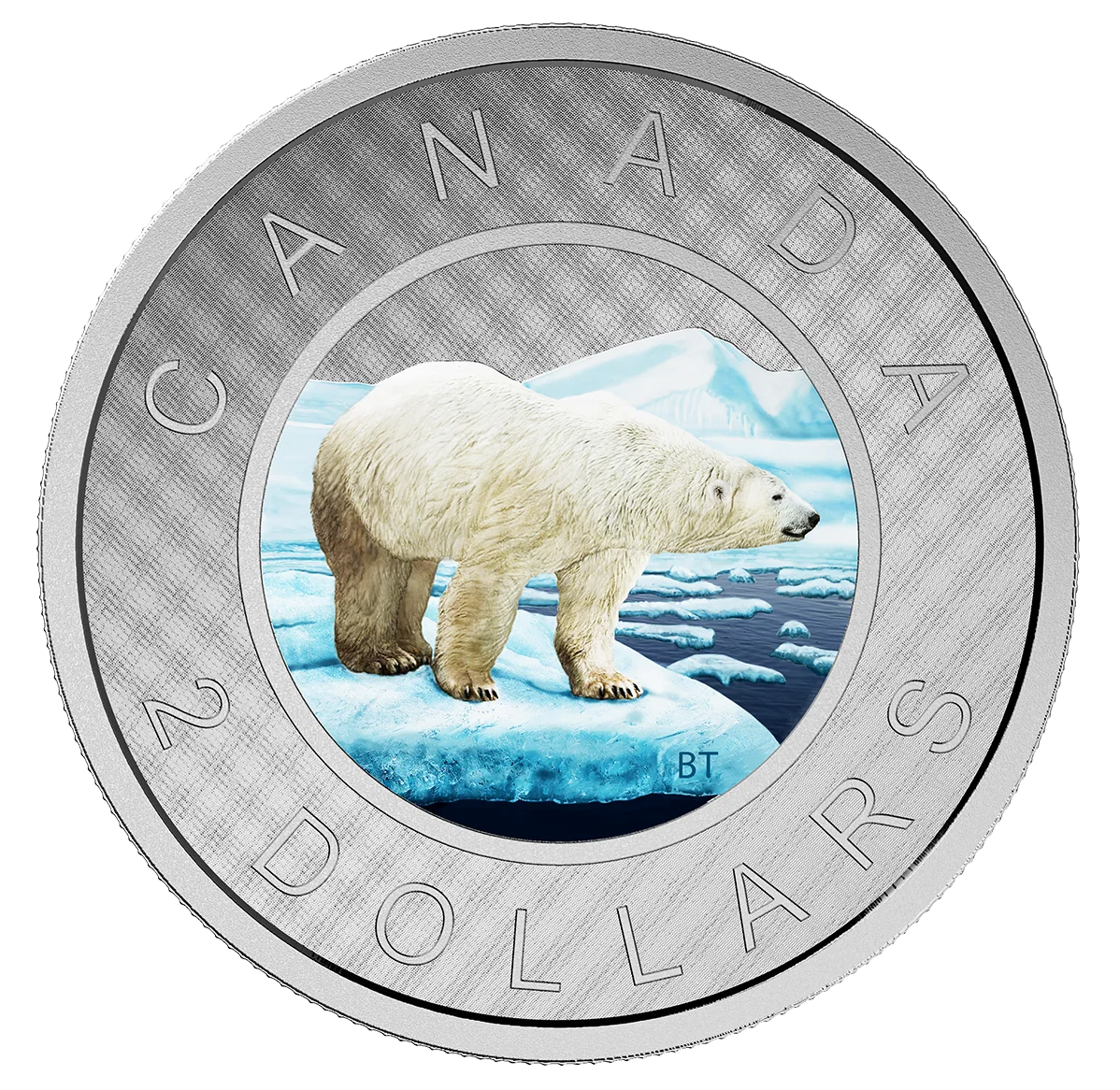 The reverse, by Brent Townsend, shows a polar bear on an ice floe surveying the Arctic summer landscape, with "CANADA" and "2 DOLLARS".
