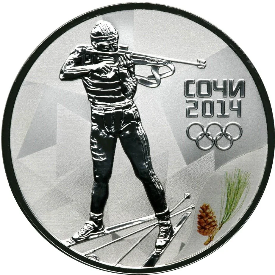 Biathlete figure, Turkish pine branch, SOCHI 2014, Olympic rings.