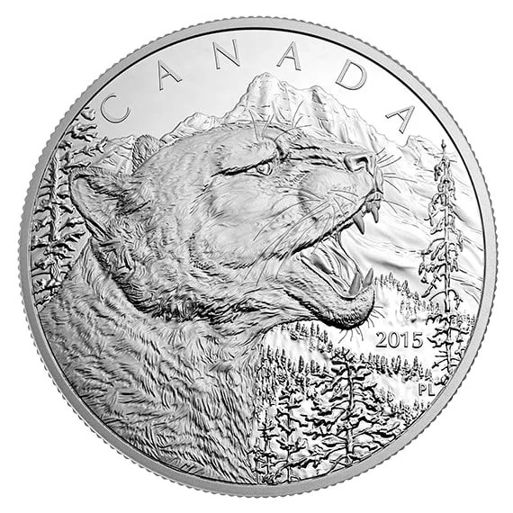 Growling cougar in profile with mountain forest backdrop.