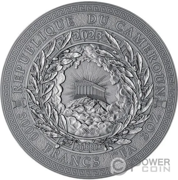 Temple on Mount Olympus encircled by a wreath, with a meander border.