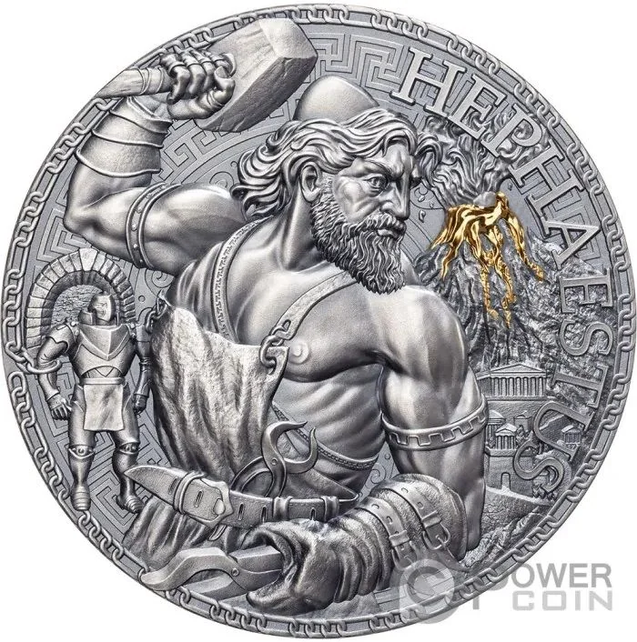 Hephaestus bust, facing right with hammer and tongs. Volcano above a temple on right, armor on left.
