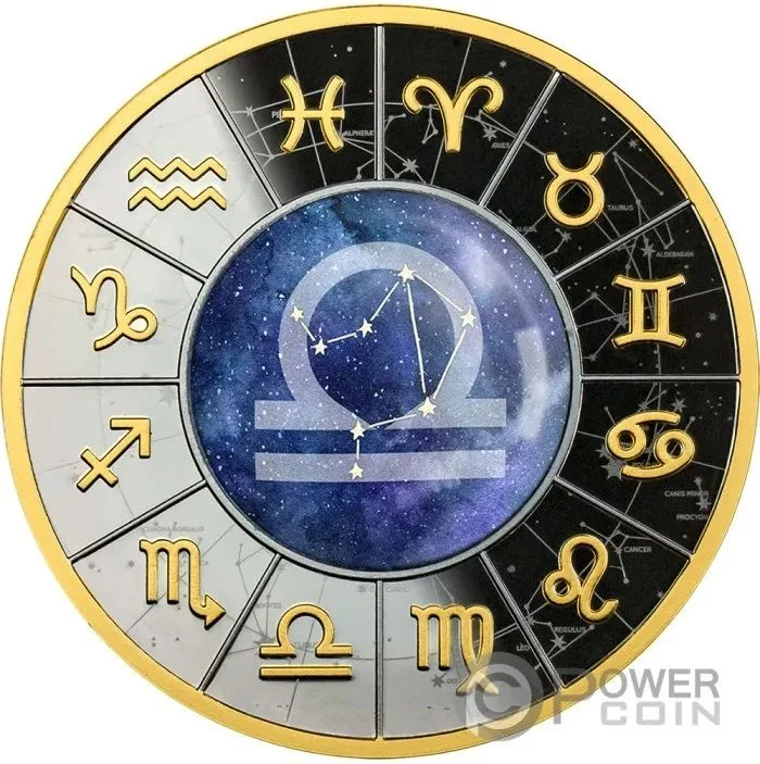 Libra sign magnified, centered. Zodiac signs encircle it against a night sky.