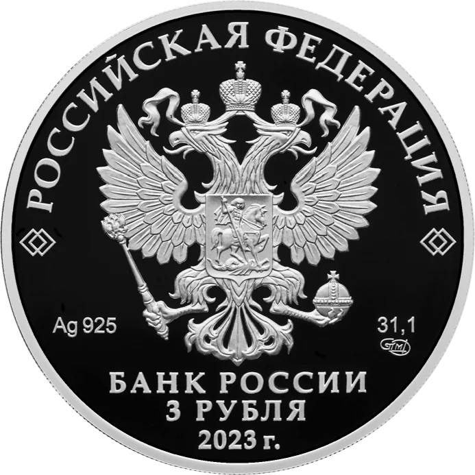 The obverse features the Russian coat of arms, inscriptions for "Russian Federation" and "Bank of Russia," the denomination "3 Roubles," the issue year "2023," the metal's chemical symbol, fineness, mint mark, and fine metal content.