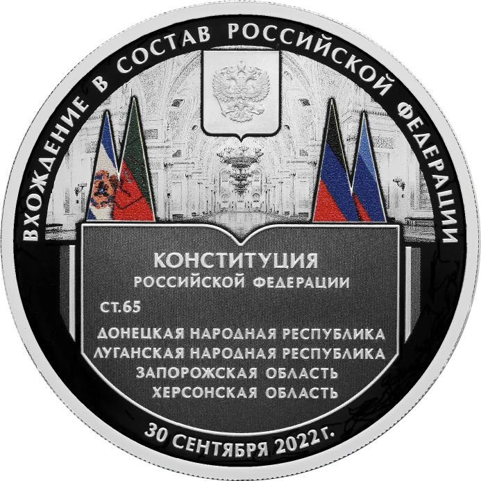 The reverse features a stylized Constitution of Russia open to Article 65, set against St. George's Hall, the National Coat of Arms, and the colored flags of the Donetsk and Lugansk People's Republics, Zaporozhye, and Kherson. The Constitution and Hall have a matte laser finish, while the Coat of Arms and constitutional text are in relief. Surrounding inscriptions read "THE ACCESSION TO THE RUSSIAN FEDERATION" and "30 SEPTEMBER 2022".