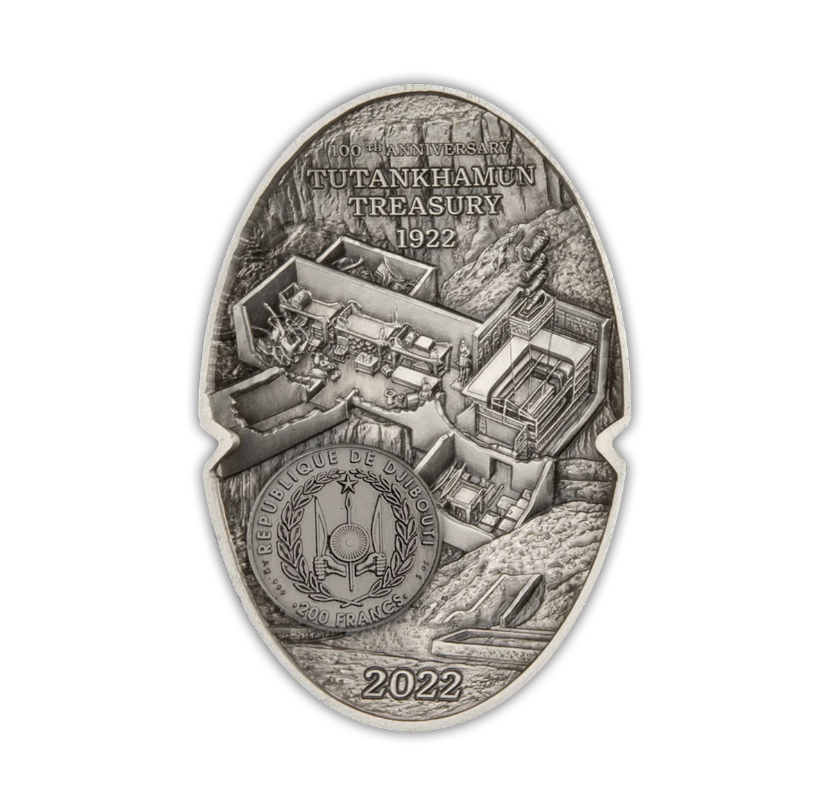 Description: Tutankhamun's tomb excavation scene. Left lower half: Djibouti coat of arms with fineness, value, and mass.