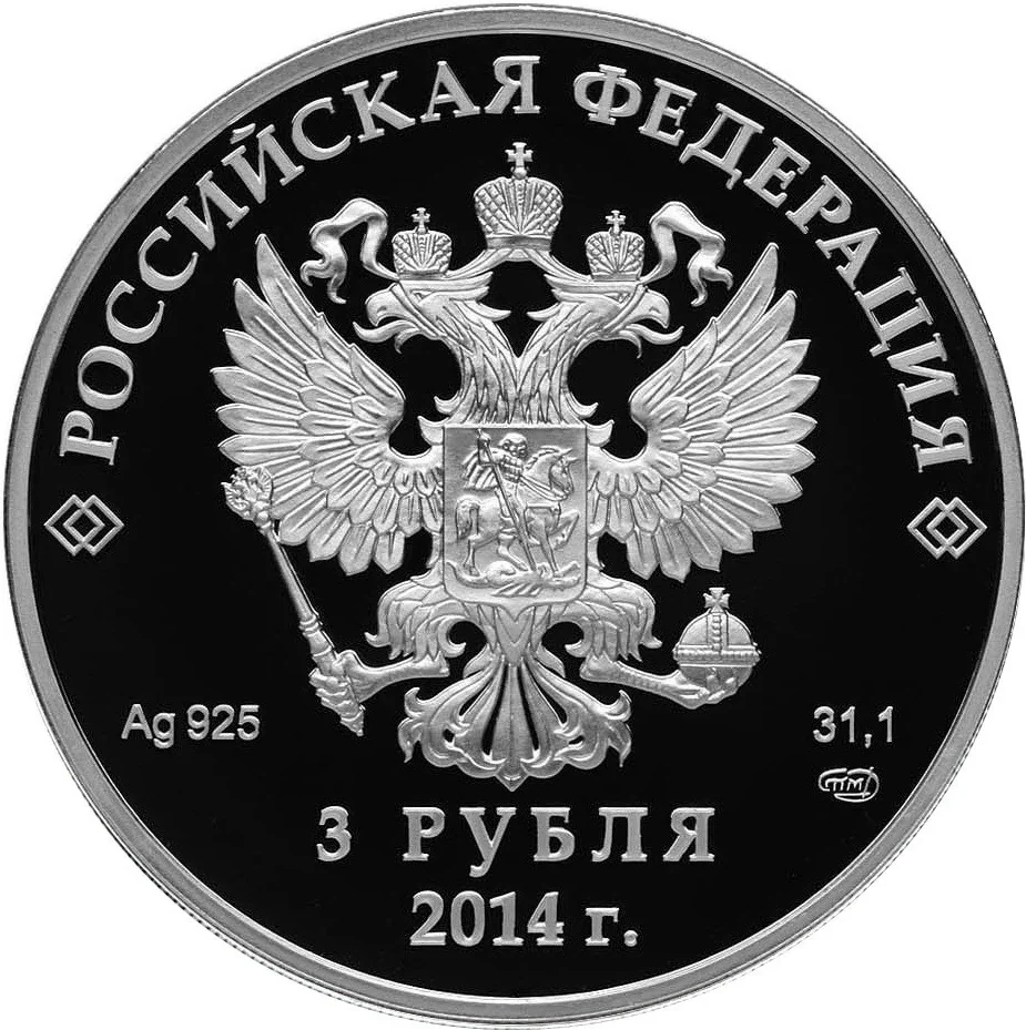 The mirror field features the State Coat of Arms of the Russian Federation. Above it, a semicircular inscription reads "РОССИЙСКАЯ ФЕДЕРАЦИЯ". Below, left: the metal and purity; right: the fine metal content and mint mark. Centered at the bottom: the denomination "3 РУБЛЯ" and the date "2014 г.".