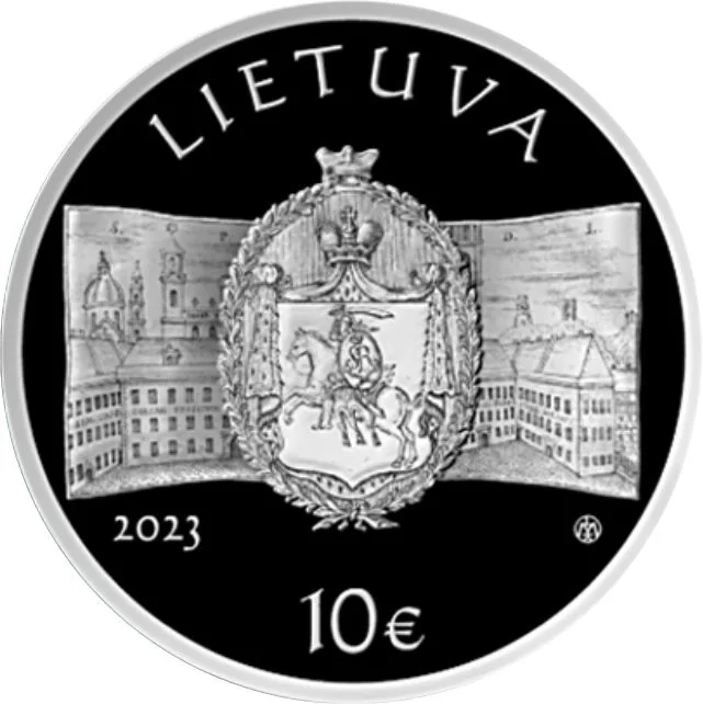 The obverse depicts Lithuania's coat of arms (Vytis) over a 1780s engraving of Vilnius University, with "Lietuva," €10, 2023, and the Lithuanian Mint mark.