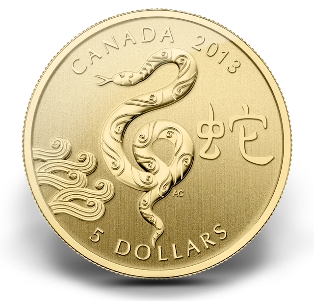 This coin combines three finishes: brilliant and mirrored surfaces on the design, with a laser-etched, matte background. Designed by Aries Cheung, it captures the Snake's "graceful and soft-spoken" nature.