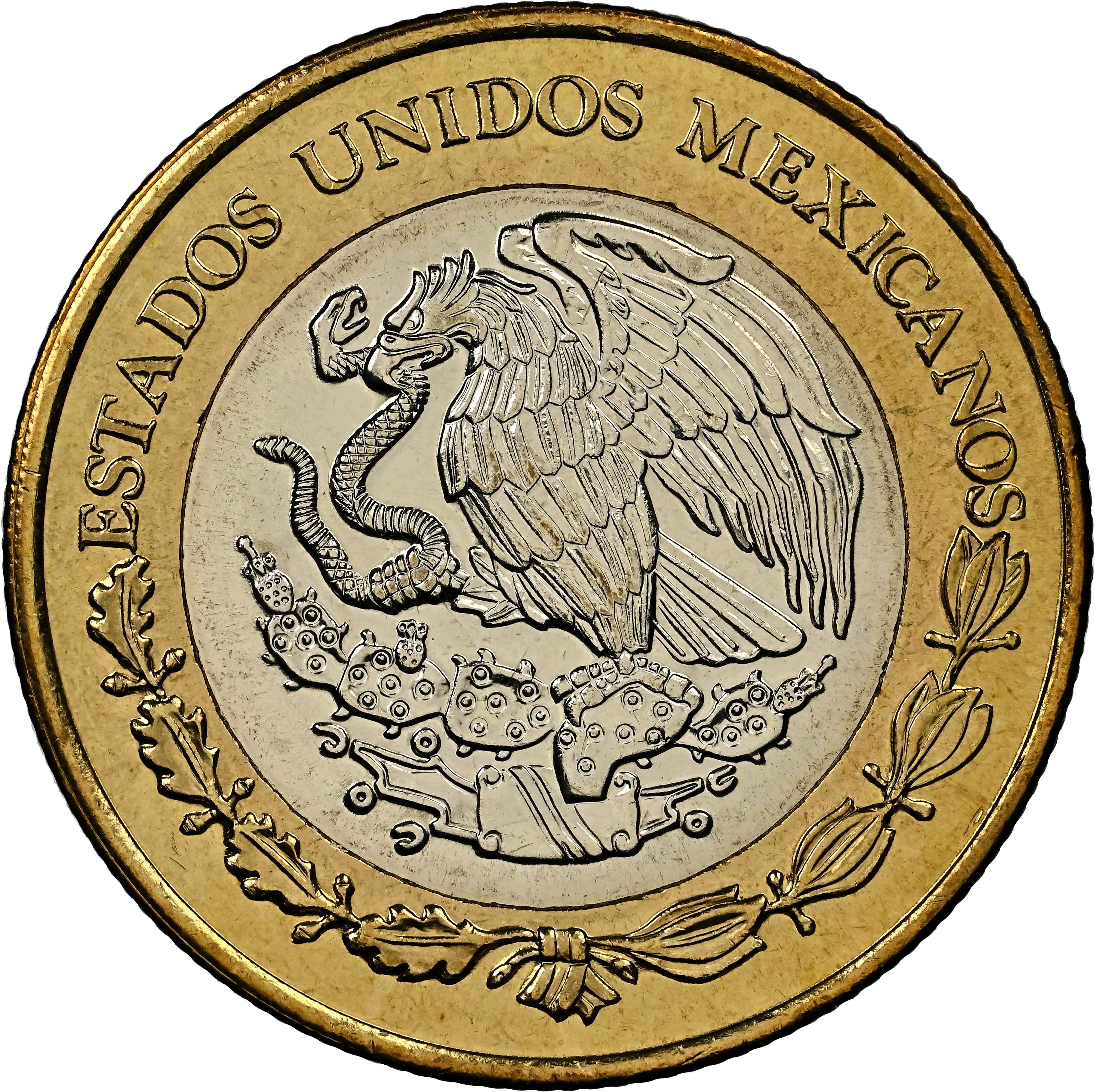 National arms: left-facing eagle on a cactus, holding a snake, above a wreath, with a semicircular inscription.