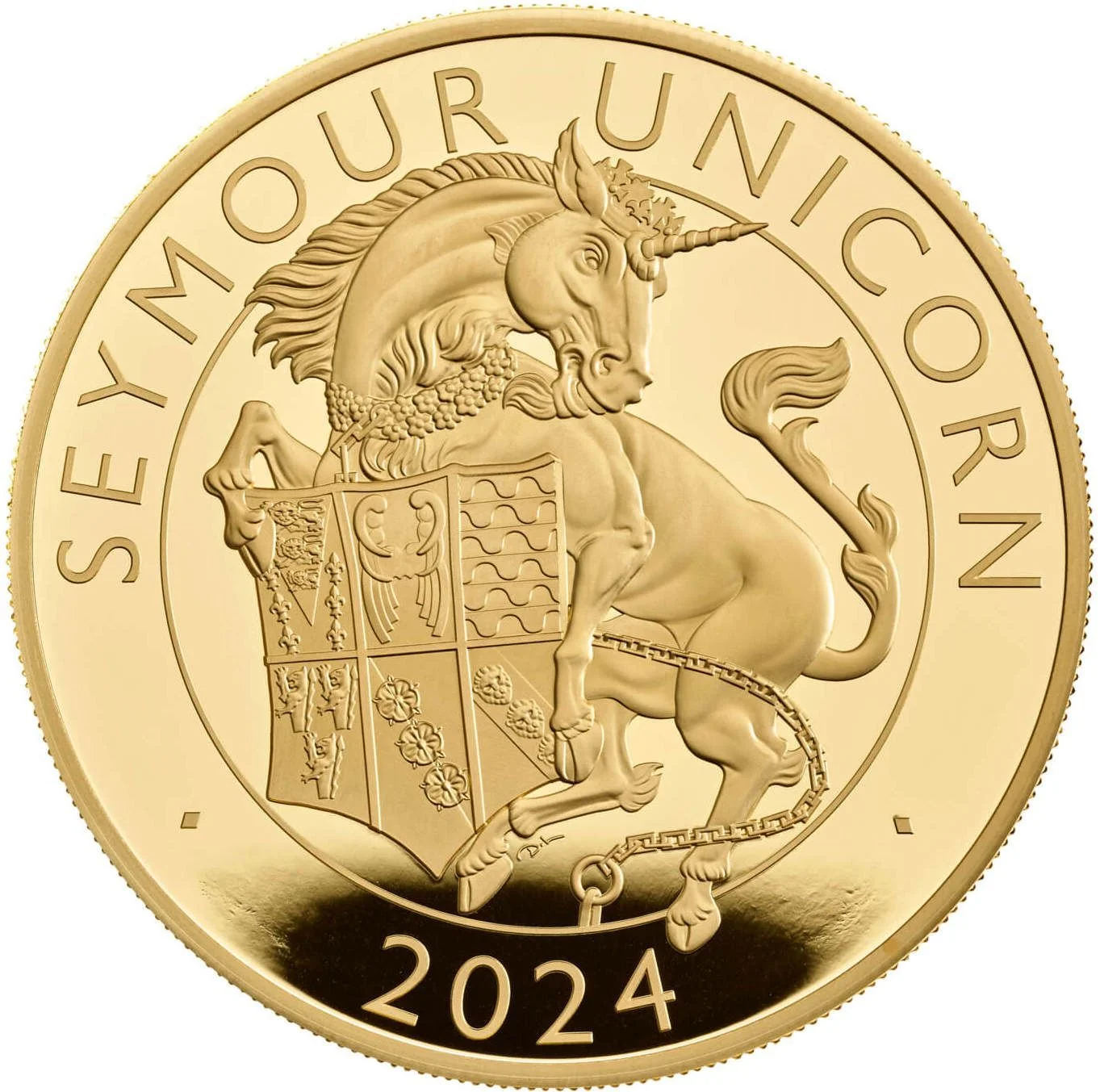 A unicorn wearing a royal coronet and a floral wreath, holding Jane Seymour's arms.