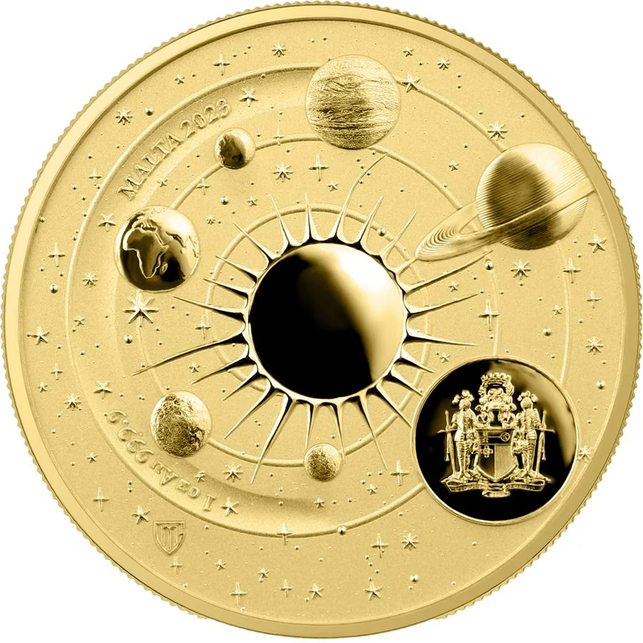 16th-century heliocentric solar system: Mercury, Venus, Earth, Mars, Jupiter, Saturn. Purity and mintmark lower left. Central Bank of Malta coat of arms lower right. Starry background.