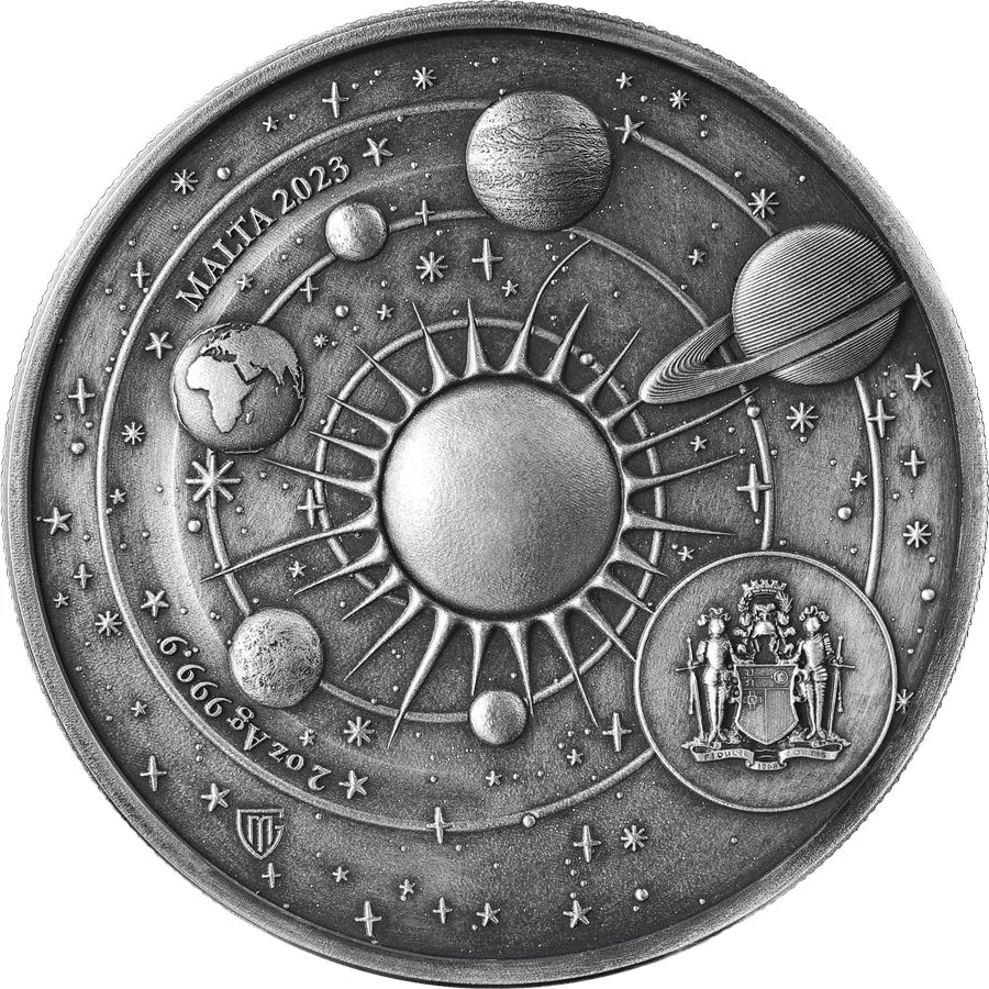 16th-century heliocentric solar system: Mercury, Venus, Earth, Mars, Jupiter, Saturn. Purity and mintmark lower left. Central Bank of Malta coat of arms lower right. Starry background.