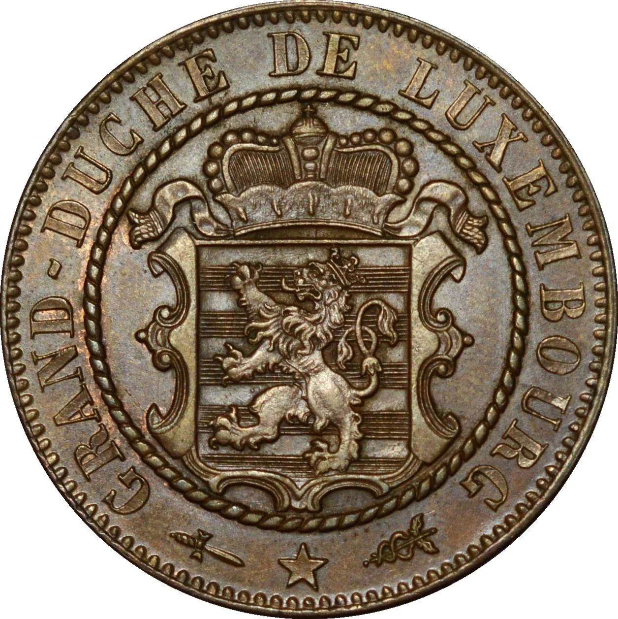 Luxembourg coat of arms: a crowned shield with a forked-tail lion on a striped field, encircled by text. Below, a star, engraver's name, and privy marks.