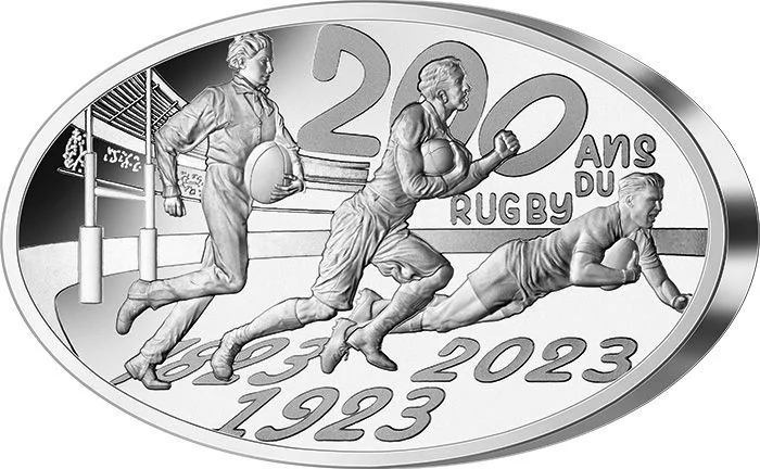 Webb Ellis Cup. Left: "RF" and Rugby World Cup XV logo. Right: face value. Encircling text: "COUPE DU MONDE RUGBY FRANCE 2023".