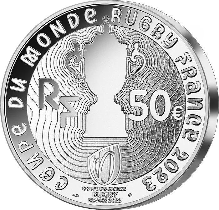 The Webb Ellis Cup, inscribed "RF" on the left and the face value on the right. Below is the Rugby World Cup logo, surrounded by the text "COUPE DU MONDE RUGBY FRANCE 2023".