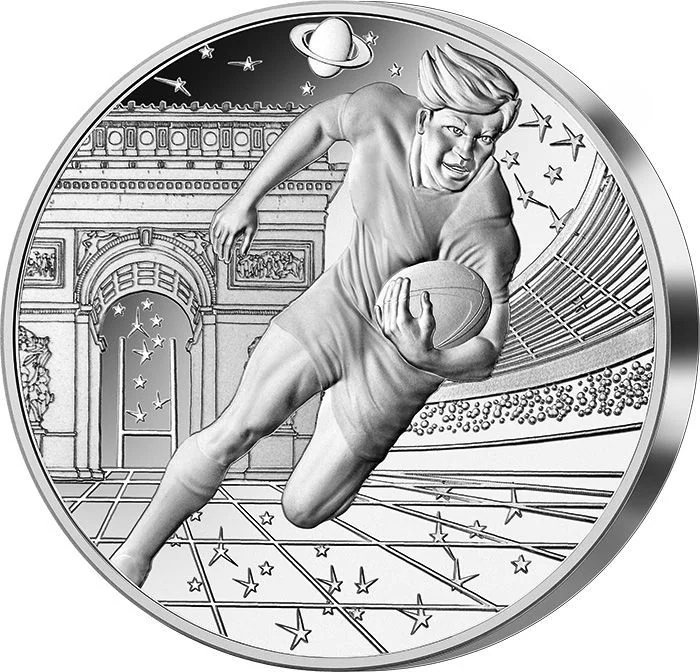 A rugby player holding a ball, with a stadium on the right and the Arc de Triomphe in the background on the left.