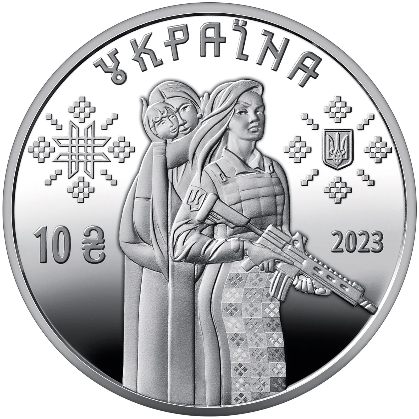 A symbolic composition embodying the courage, sincerity, and tender resilience of Ukrainian women as both defenders of the homeland and steadfast mothers, wives, and caretakers.