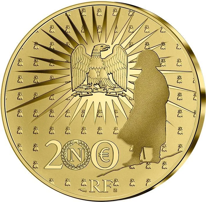 Imperial eagle with radiant sun, Napoleon's full silhouette, background bees. The "0" in "200" is a laurel wreath encircling an "N".
