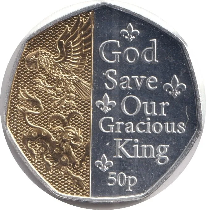 King Charles III left-facing uncrowned head. Legend around, date below.