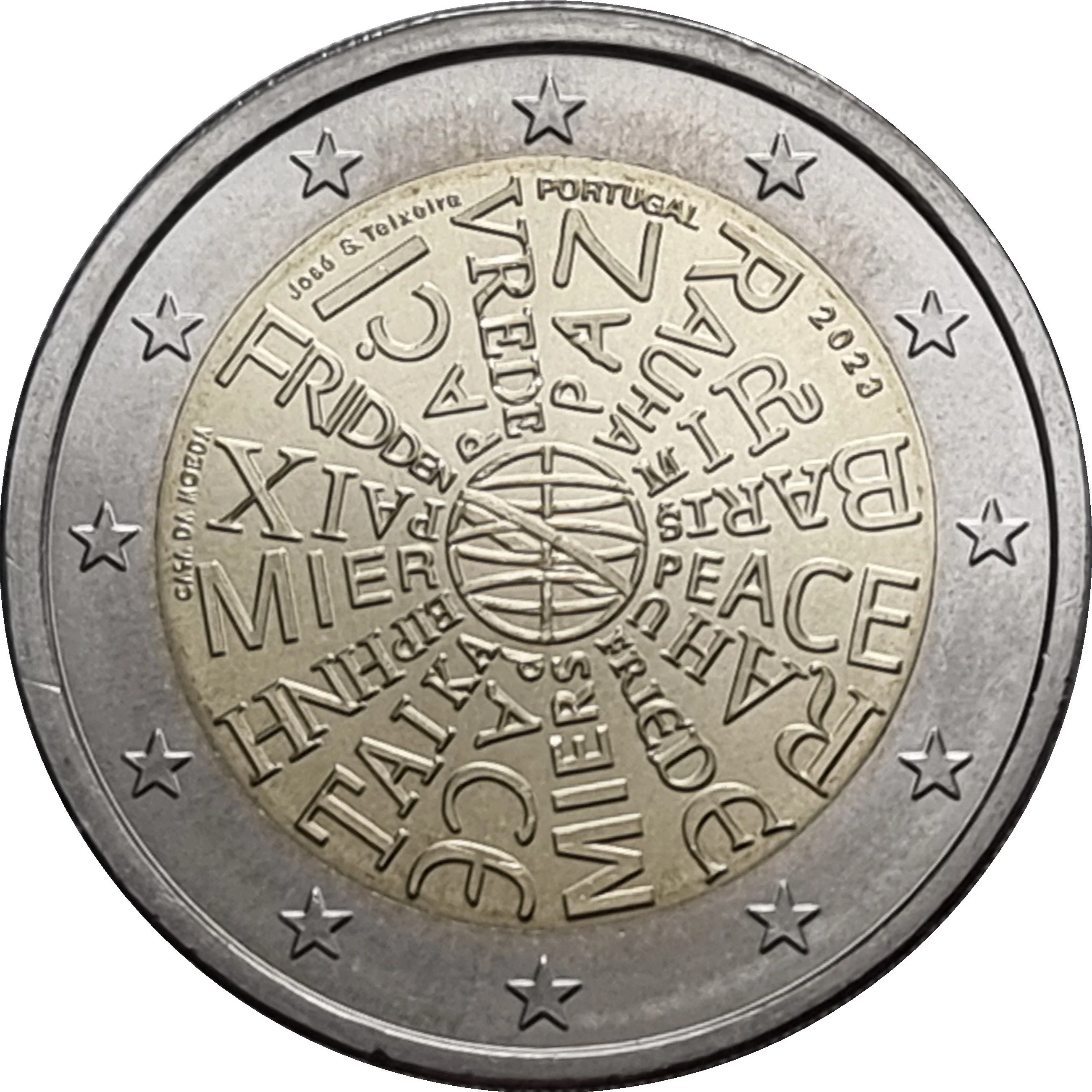 This coin radially displays ‘PAZ’ (PEACE) in the 16 official languages of the Eurozone as of 2023. ‘PORTUGAL’ and the year ‘2023’ appear at the top, with designer ‘José S. Teixeira’ and the mintmark ‘CASA DA MOEDA’ at the left. The outer ring features the 12 stars of the European flag.
