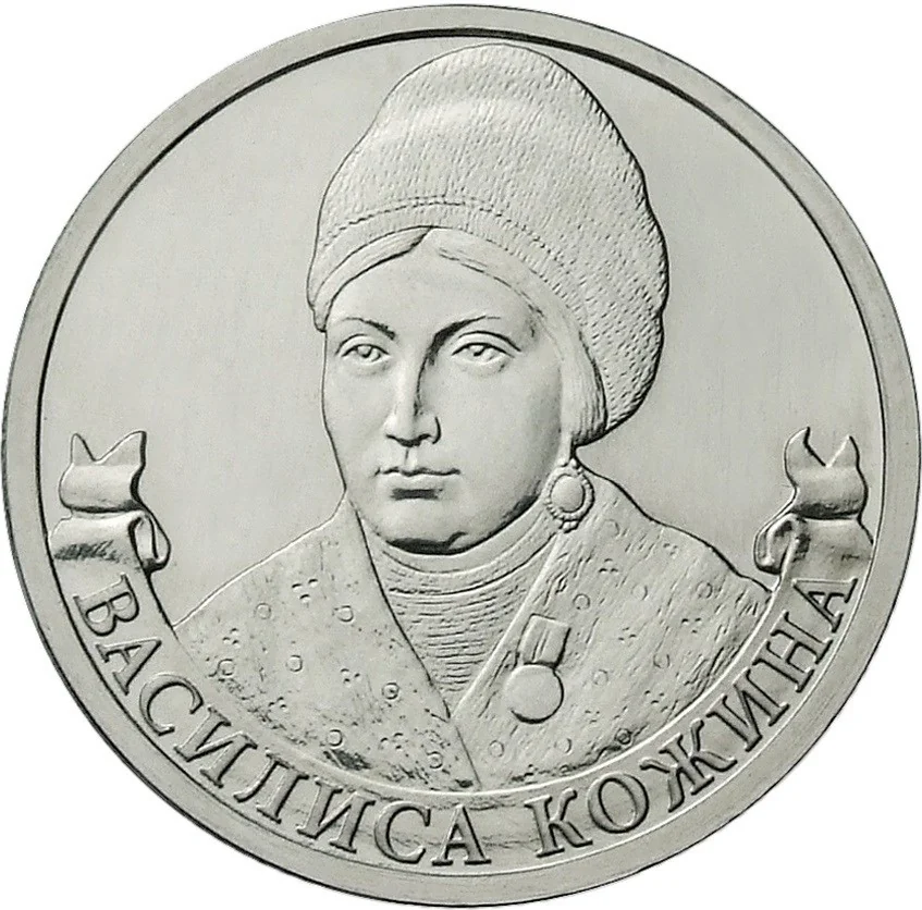 Portrait relief bust of Vasilisa Kozhina, with "ВАСИЛИСА КОЖИНА" inscribed on a ribbon below.