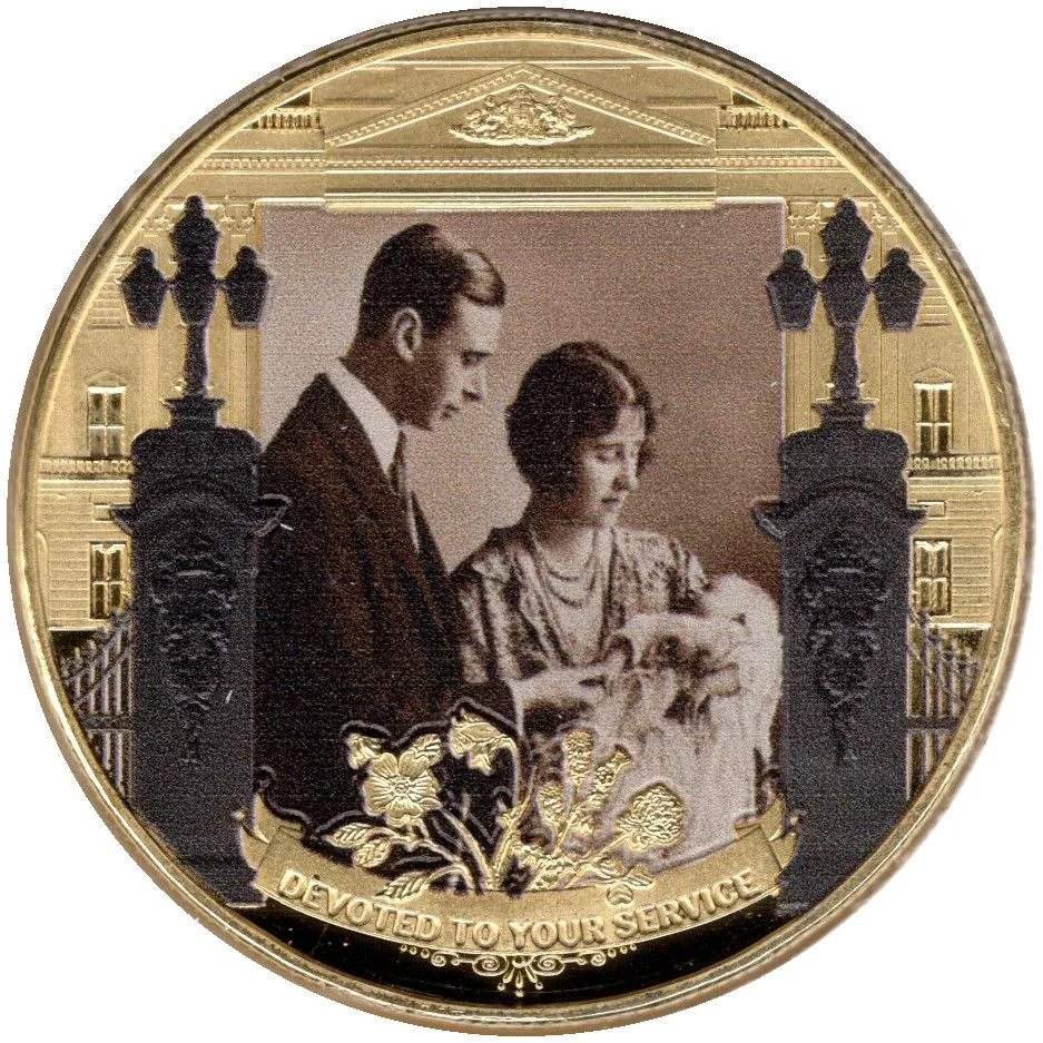 A photograph of one-month-old Princess Elizabeth with the Duke and Duchess of York, taken for her christening. It is bordered by Buckingham Palace gates and features a bouquet with an inscribed ribbon.