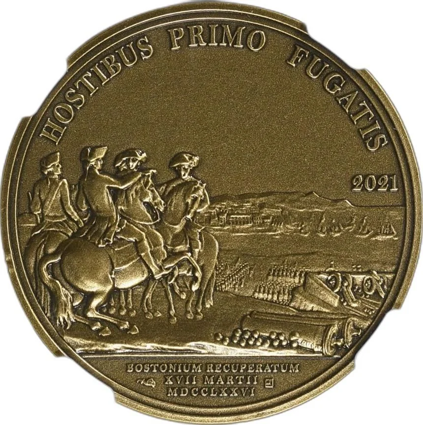Washington leads officers toward Boston, with a fort, cannons, and fleeing British ships to the right.