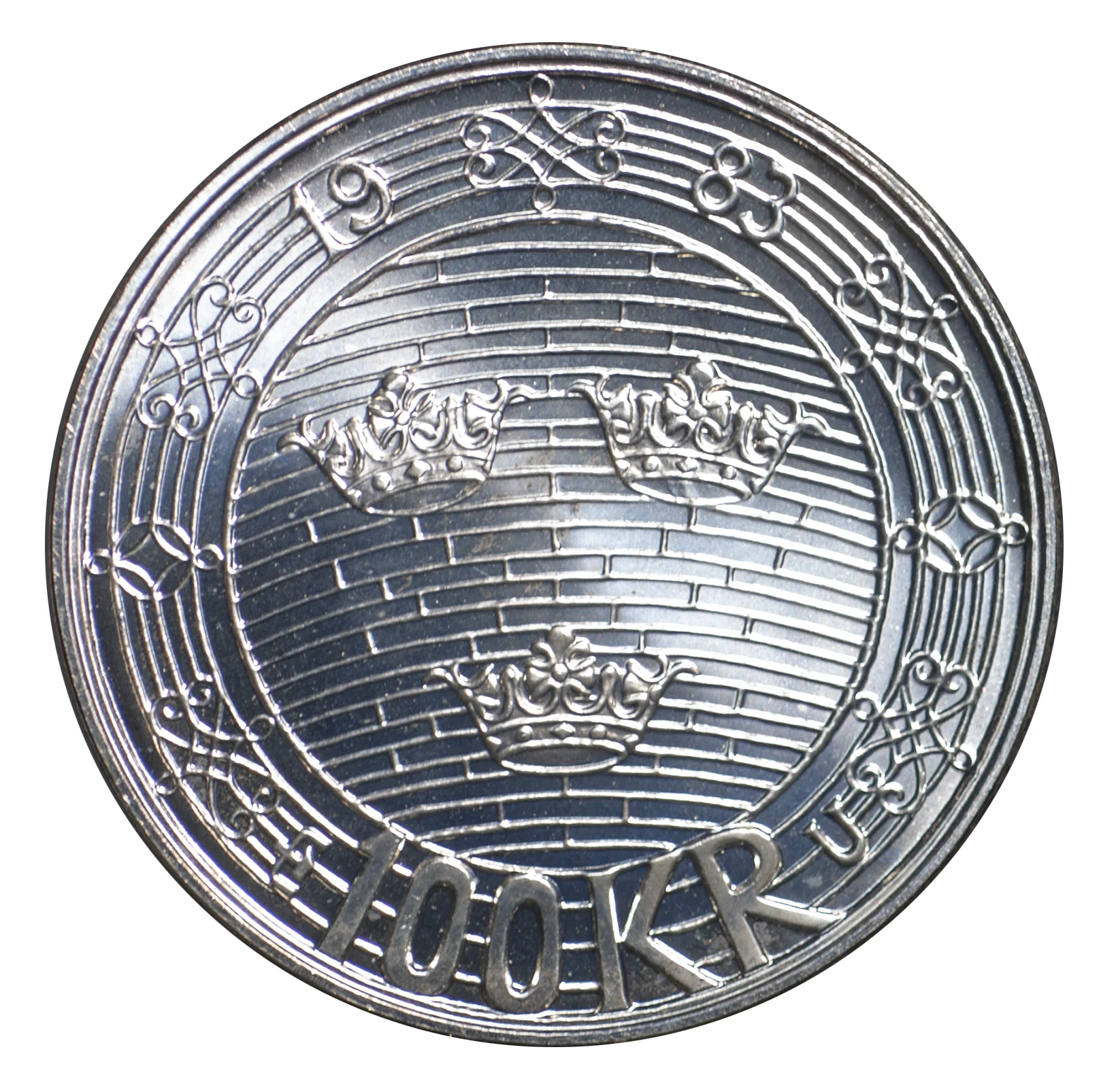 Sweden's national emblem (Three Crowns) on a brick circle from the Chamber window. The ornamental border shows the date above and value below. The flanking letters E (for mint: Eskilstuna) and U (for the Riksbank Governor's surname initial).