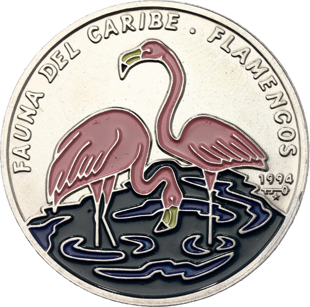Flamingos in shallow water with curved event legend above and sides, date and mintmark on right.