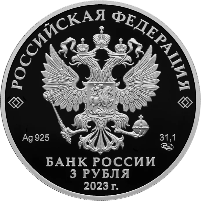 The obverse features the Russian coat of arms, inscriptions for "Russian Federation" and "Bank of Russia," the denomination "3 Roubles," the issue year "2023," the metal's chemical symbol, fineness, mint mark, and fine metal content.