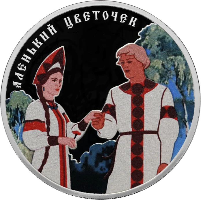 The reverse features a colored scene from 'The Scarlet Flower' and the relief inscription "АЛЕНЬКИЙ ЦВЕТОЧЕК" along the left circumference.