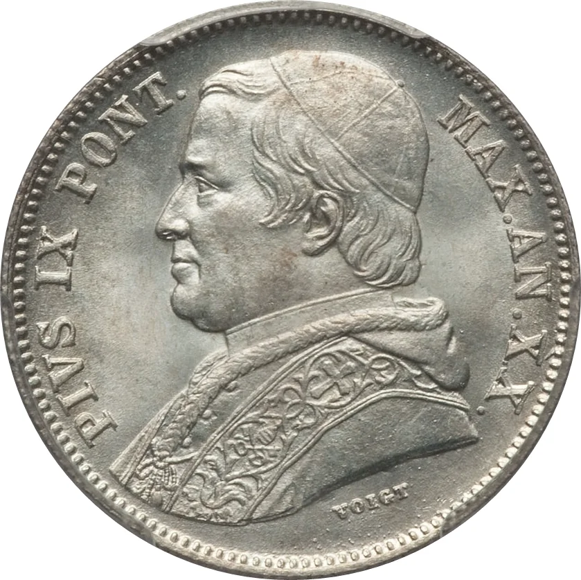 Consequently, the monetary landscape was in a state of unresolved tension. While the government of Pope Pius IX maintained its mint and adhered to the LMU standard, the de facto circulation of foreign coins and the looming political end of the Papal States created an unstable and dual system. The Papal Scudo was, in essence, a currency living on borrowed time, its authority eroded not by economic policy but by the imminent force of Italian unification, which would culminate in 1870 with the capture of Rome and the full adoption of the Italian lira.