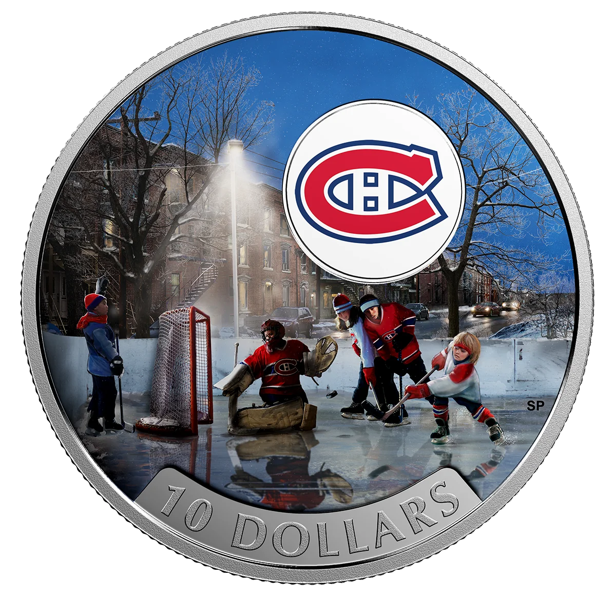 Colorized Canadiens logo with kids playing hockey in background. Value below.
