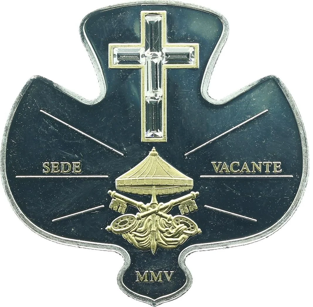 Swarovski cross over gilt umbraculum and sede vacante papal arms.
