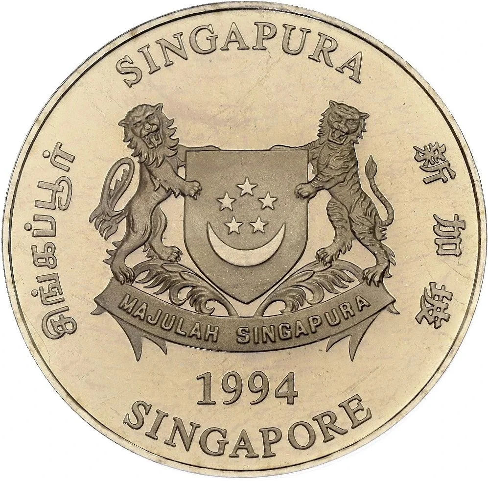 Emblem with date; 'Singapore' encircles it in English, Tamil, Chinese, and Malay.