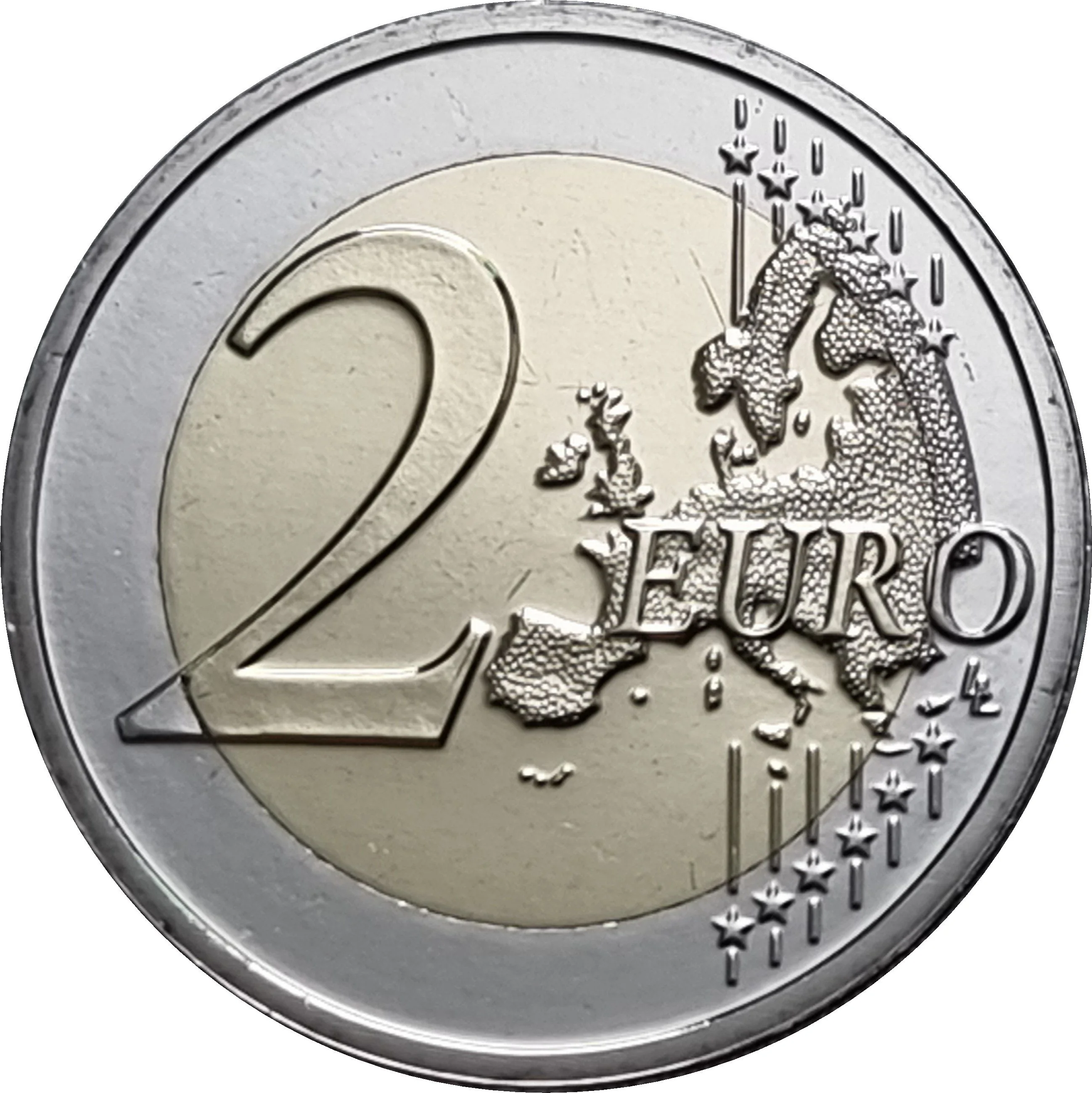 A Western Europe map spans the coin's right side, with "2 EURO" overlaid—the "2" in the Atlantic. Twelve stars flank the map, six above and six below, connected by six vertical stripes across the inner core.