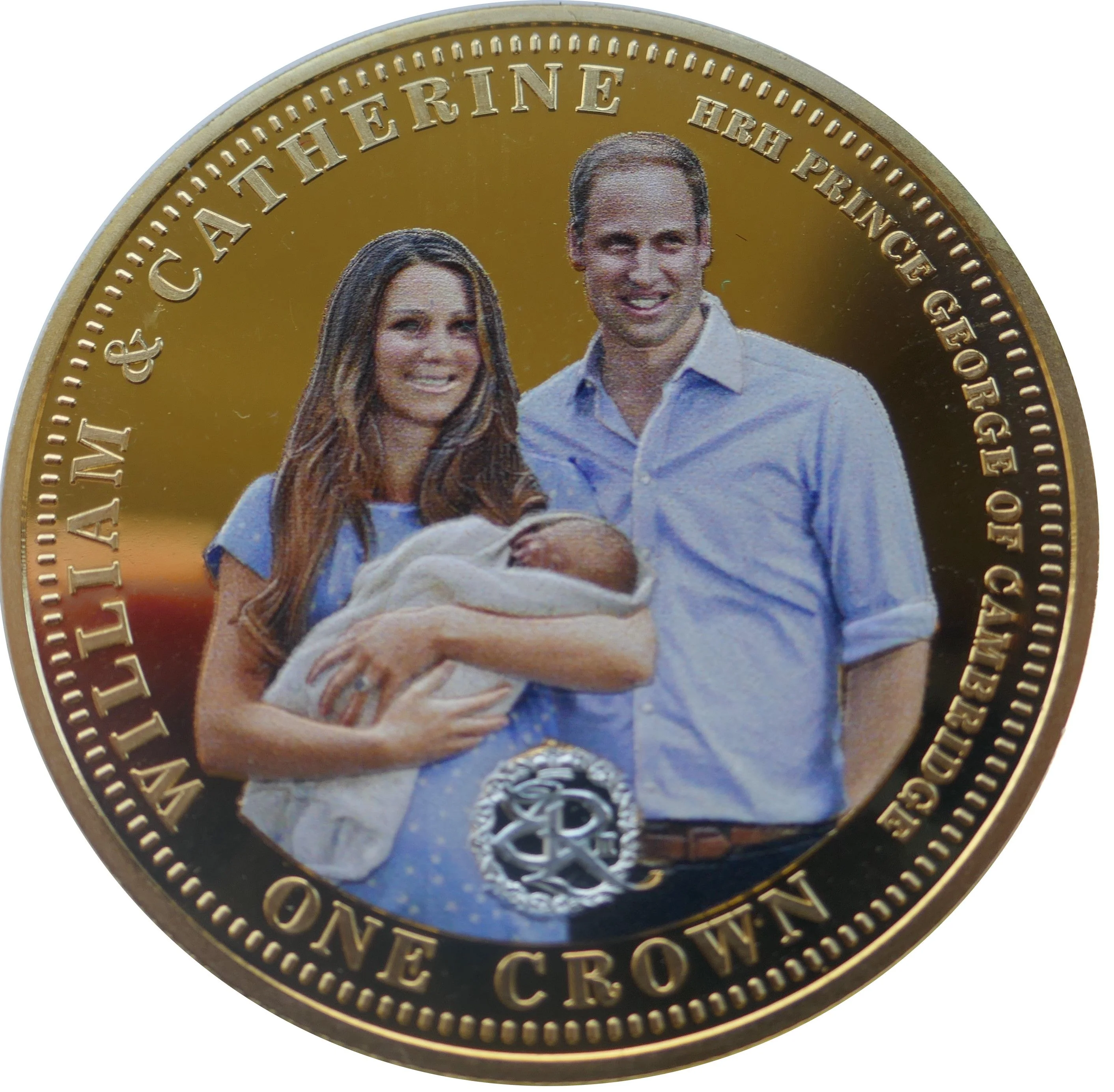 Prince William, Catherine, and Prince George. Royal cypher and value below.