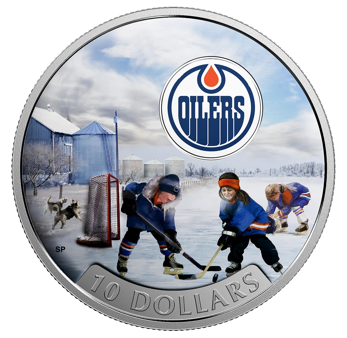 Colorized Oilers logo with kids playing hockey in background, value below.