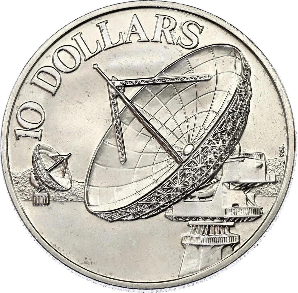 Central right: large satellite dish. Left: smaller dish. Denomination above.